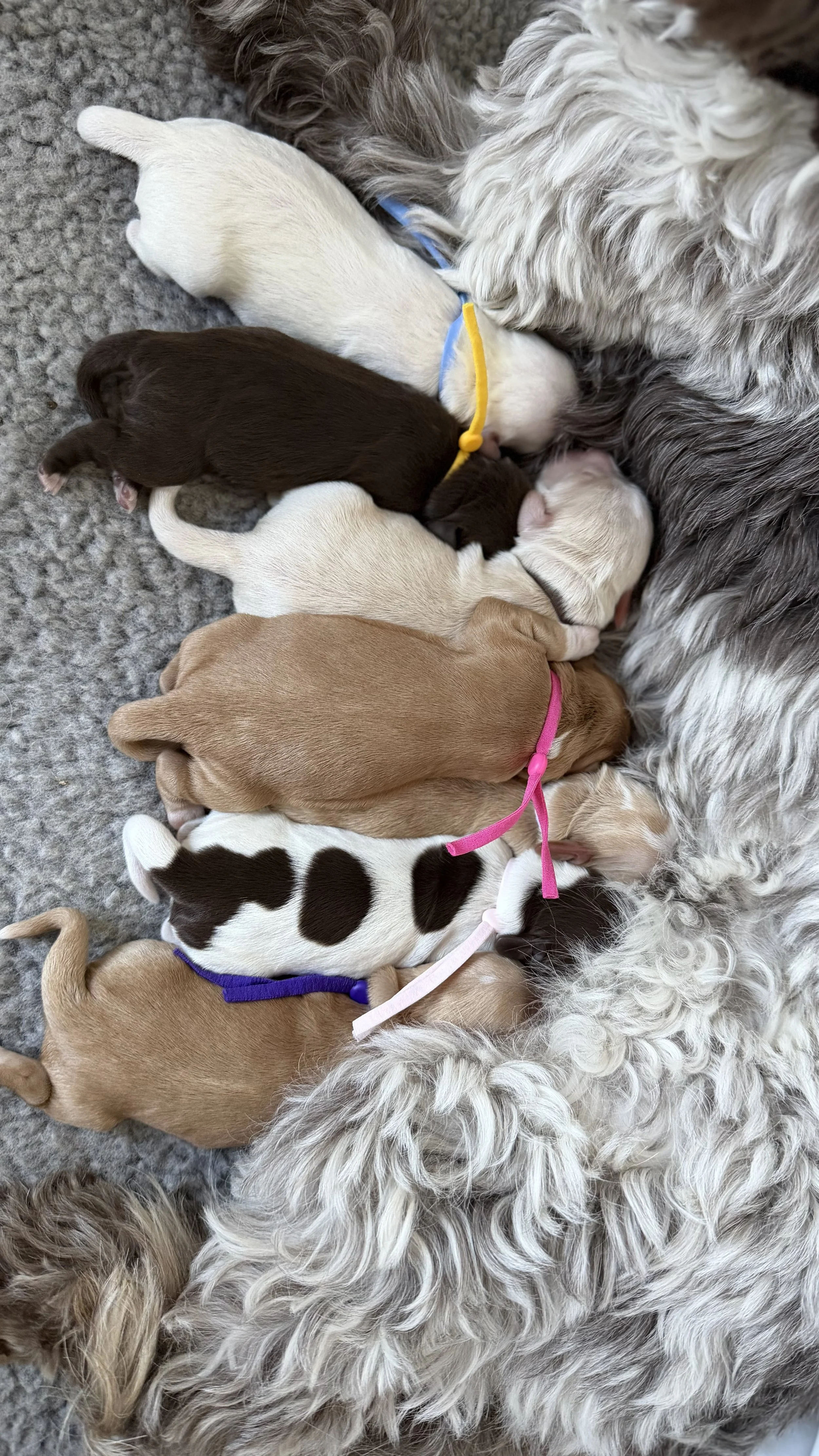 This litter includes apricot, caramel, and chocolate coats in solid, parti, and tuxedo patterns, with soft fleece textures that are both striking and low-shed.